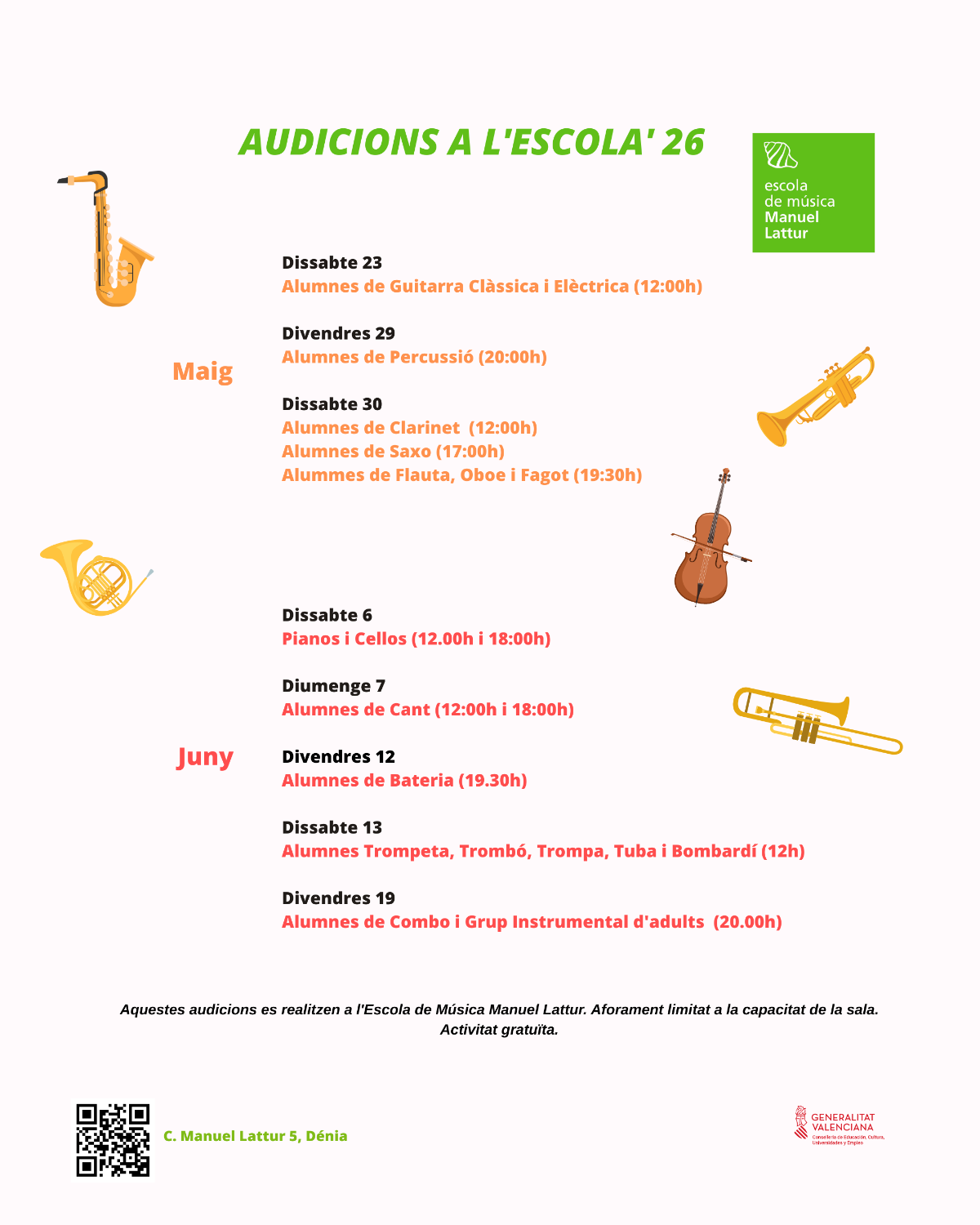 En aquestes audicions participa la totalitat de l’alumnat de les especialitats, des dels alumnes que han iniciat els seus estudis aquest curs fins a aquells que es troben cursant Grau Professional. L’objectiu principal d’aquesta activitat és afavorir el desenvolupament escènic de l’alumnat, ajudant-lo a superar la por escènica i a adquirir una major seguretat i relaxació en les interpretacions públiques.